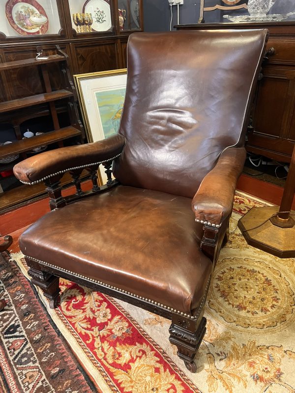 Constructed from solid beech, this exceptional antique library chair makes a superb statement piece or a wonderfully comfortable single accent chair. Upholstered in quality leather showing just the right amount of natural, characterful wear, it offers both style and inviting comfort. The chair stands on tapered carved legs that elegantly terminate on ceramic castors, a hallmark of classic 19th-century craftsmanship. Lovingly cared for, the chair is presented in excellent original condition, making it ideal for a study, library, reading nook, period interior, or country home. A beautiful blend of practicality, comfort and timeless design. The dimensions are 75cms wide 90cms deep 39cms to the top of the seat and 94cms to the top of the back, I am happy to deliver locally for a small fee, or arrange a courier nationally