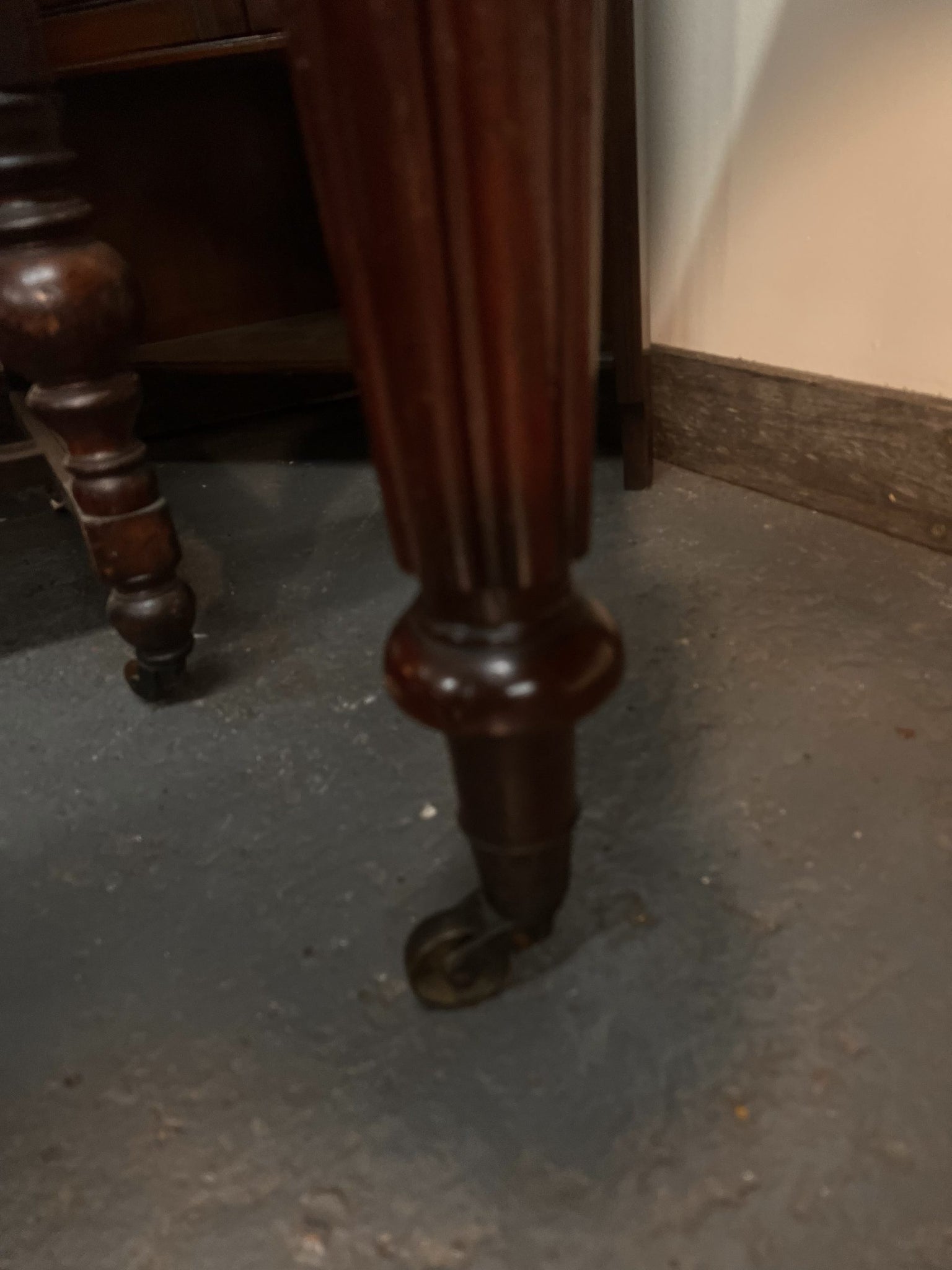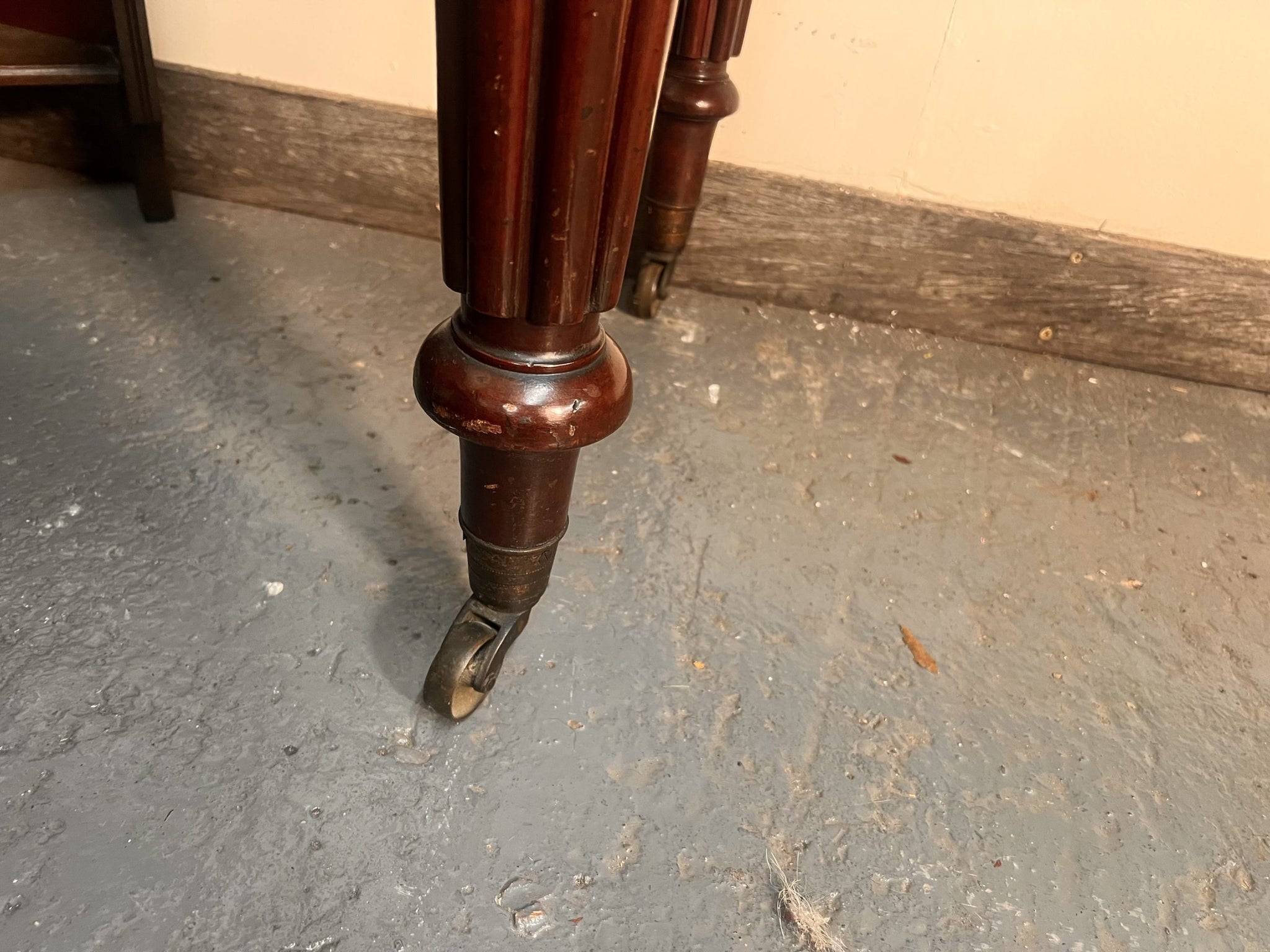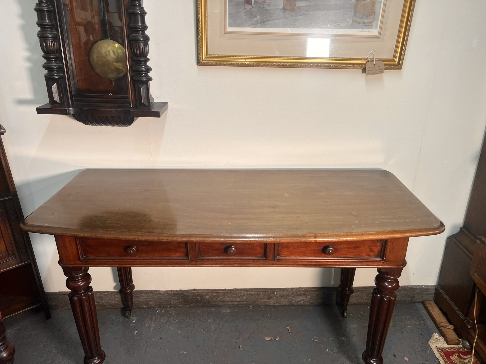 The top features a beautiful thumb-moulded edge, above three drawer fronts, with the central drawer showcasing tight, hand-cut dovetail joints and original central mahogany pull handles. It stands proudly on four stunning hand-carved fluted legs, all terminating on original brass castors.