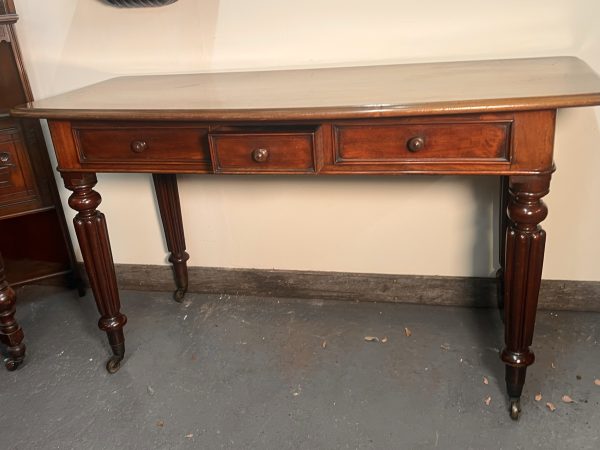 A truly graceful and elegant antique English writing desk or hall table, circa 1840, crafted from solid flame mahogany of exceptional quality. Originally designed as a console table, it fits neatly along a hallway, behind a sofa, or beneath a window, making it both practical and highly decorative.