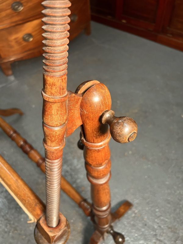 A beautiful piece of lathe turned walnut furniture, this a lady's sewing stand would be used for needlework, embroidery, or quilting, this one is floor standing, made for larger work use, a stretcher to hold the fabric or canvas tight so needlework can be worked beautifully. Entirely made of solid wood , appearing to be walnut with a wonderful, warm aged patina or finish. Four hand carved butterfly wing nuts working on hand carved threads keep the fabric in place, two more hand carved nuts tighten the angle of the frame, It comes apart into small bundle for storage or for shipment, and assembles quickly when one wishes to put it to use, a fabulous looking piece that can still be used to work on pieces or would be a great way to display that wonderful tapestry, the dimensions are 105cms standing 115cms tall, the working frame is 90cms by 65cms tall so a really good size, I am happy to deliver locally for a small fee, or arrange a courier nationally